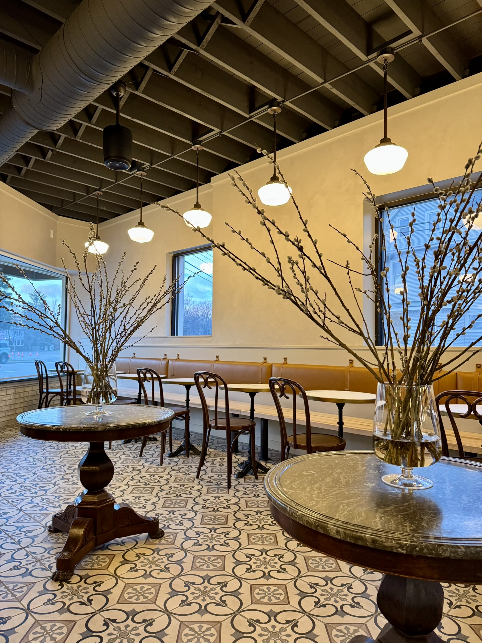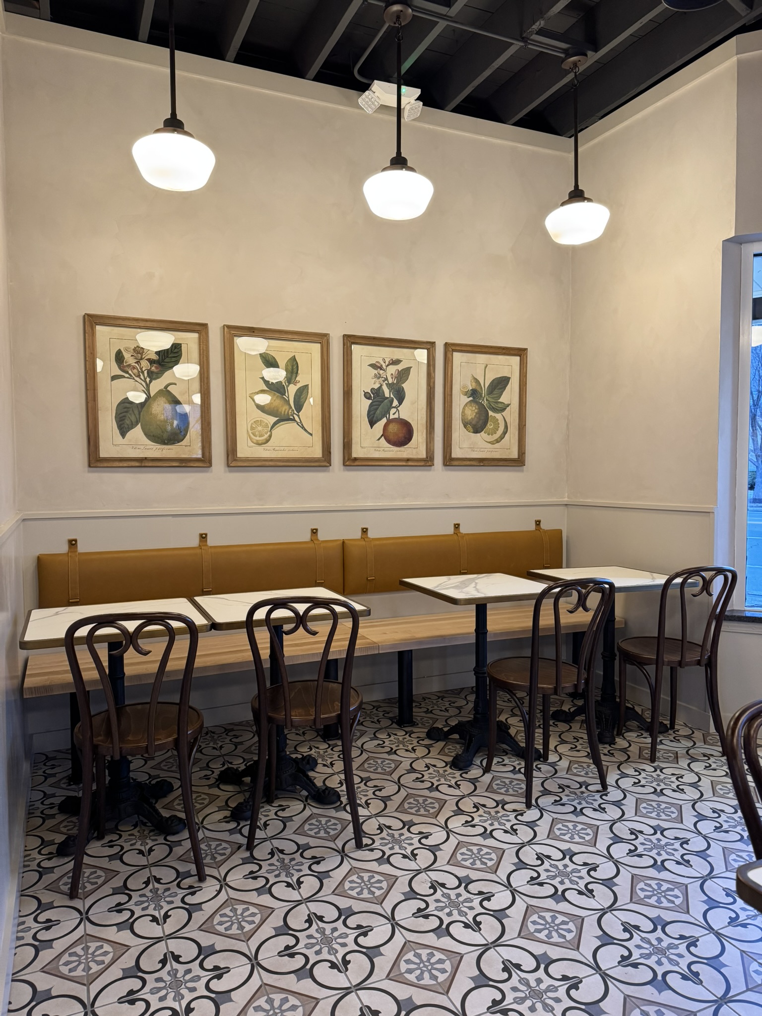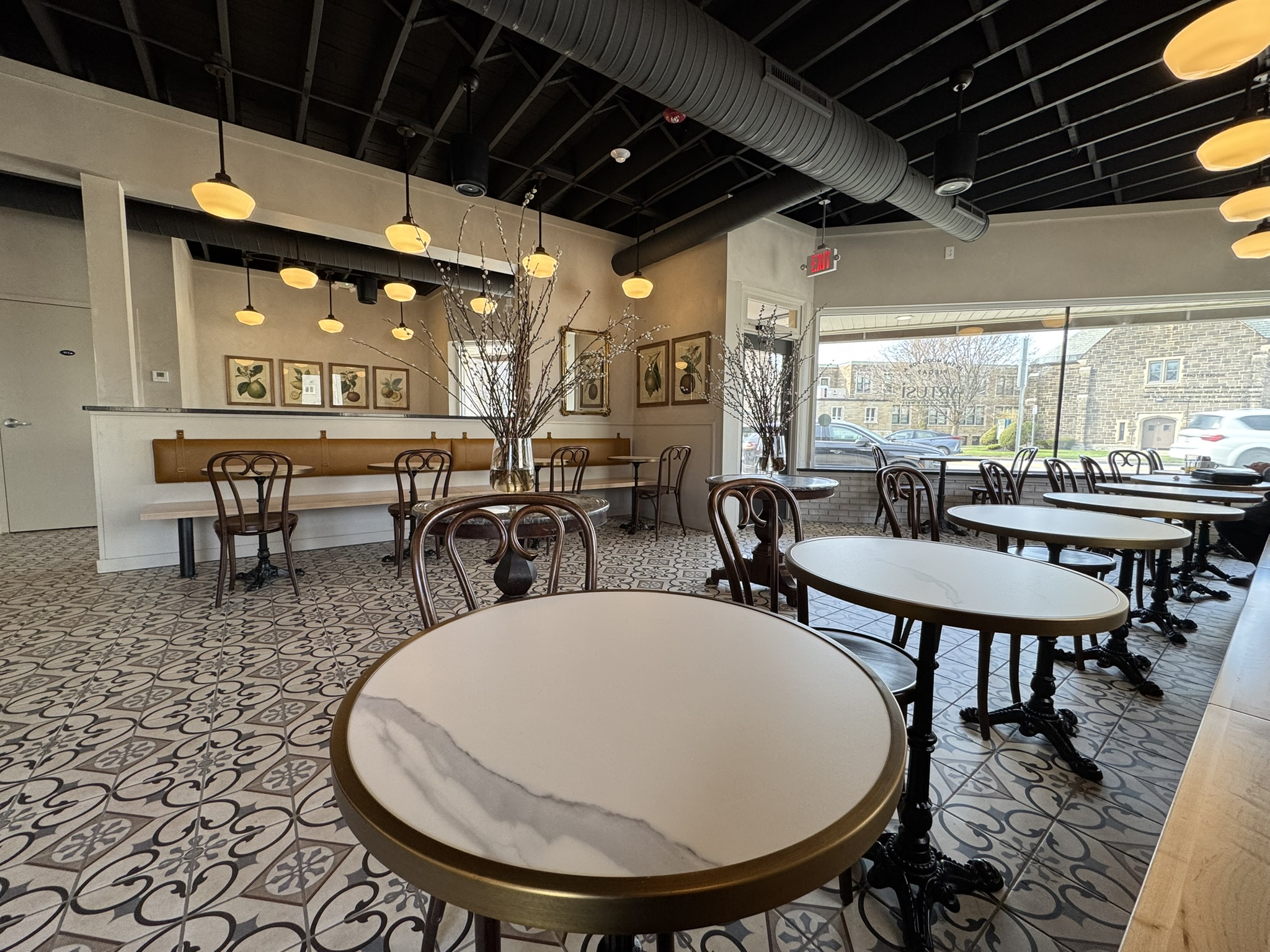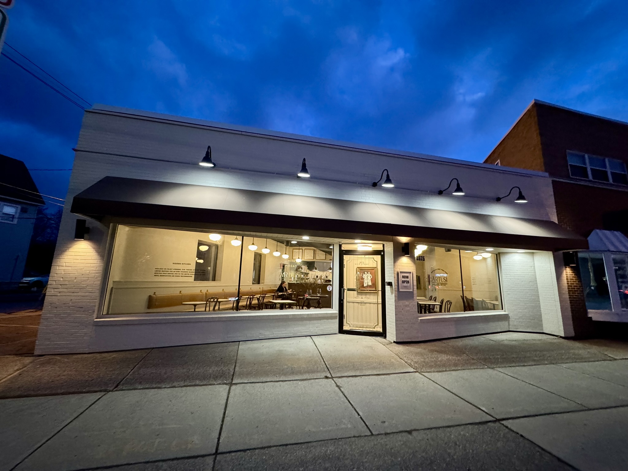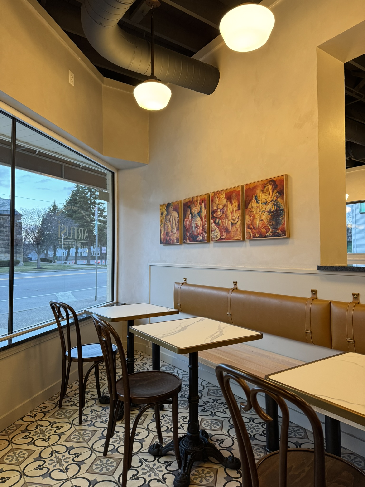 The interior renovation included a new commercial kitchen, presentation cooking& prep area, two (2) dining spaces, and two (2) single-occupant restrooms. In the Dining Room, the ceiling structure was left exposed to make the space feel expansive. The banquettes ring the perimeter walls, opening the center up for wait-staff and patron circulation. The large storefront windows bring in natural northern light while accent lighting over the banquets adds an intimate vibe.