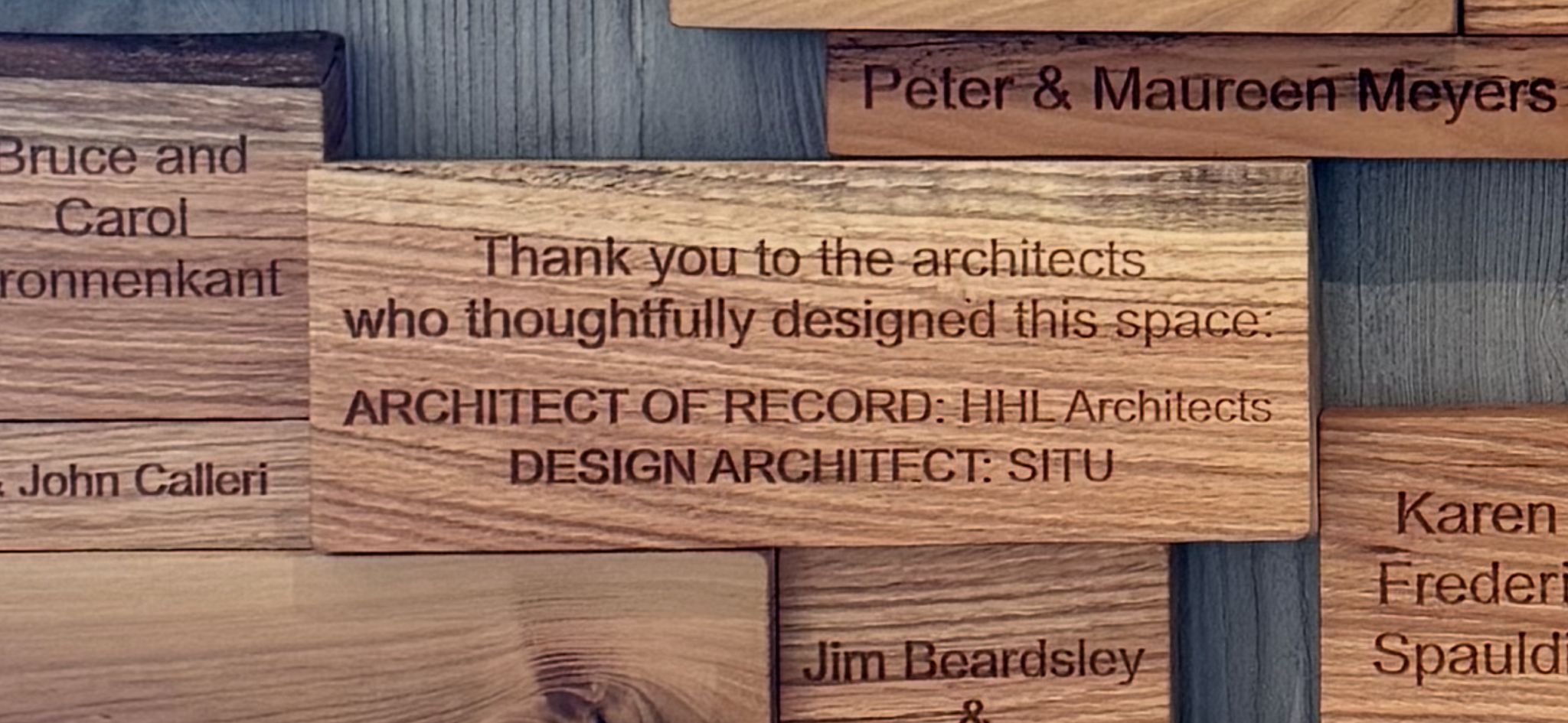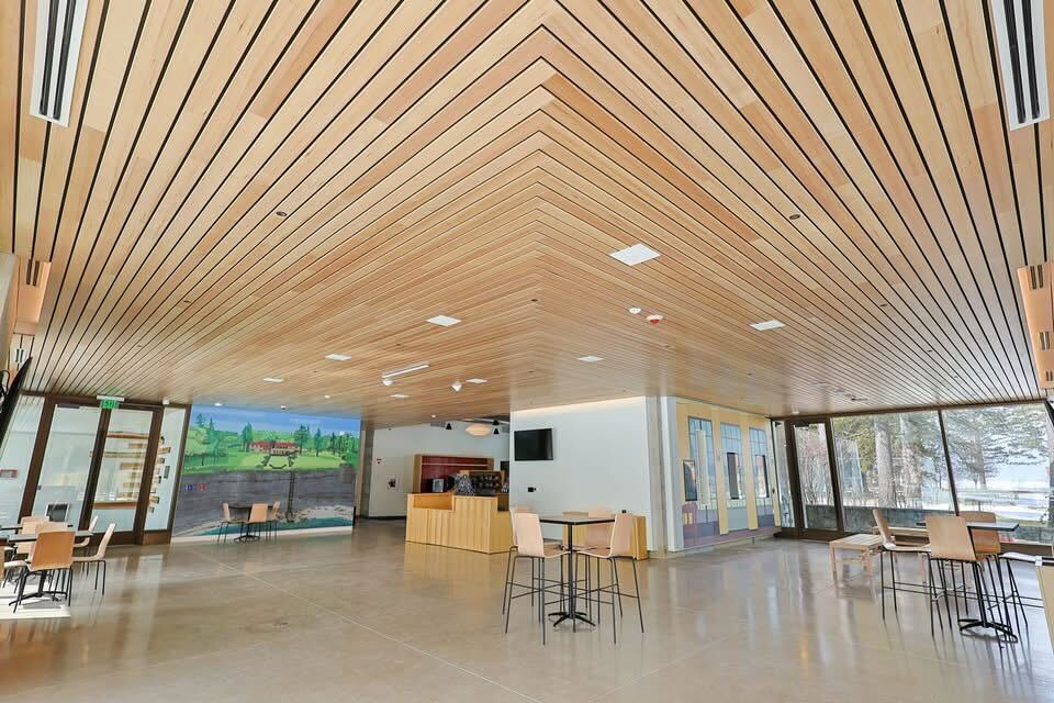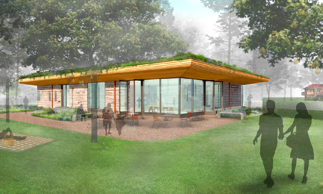 The building is topped by an intensive green roof that cantilevers outward toward a restored fruit orchard creating an outdoor covered porch area. Clad in natural wood, this prominent roof feature seeks to bring the outside in and ensconce the new Center within the existing landscape.
